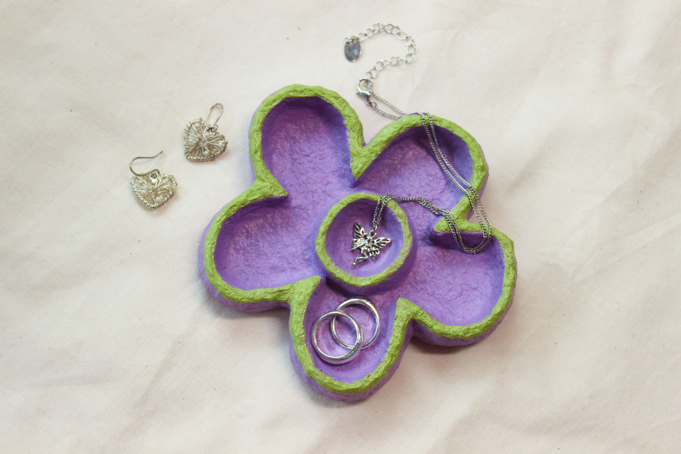If you’ve found yourself frantically searching for the other earring while your s.o. frantically paces the doorway because you were supposed to be already there, then I have just the thing for you. The Forget-me-not Trinket tray has 6 sections (sort-of) where you can put your earrings, rings and whatnots. It’s cute, it’s made entirely of paper mache (made from junk mail no less!), and it’s very function. Win-win-win.